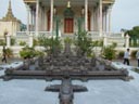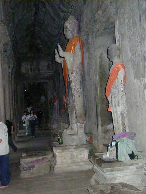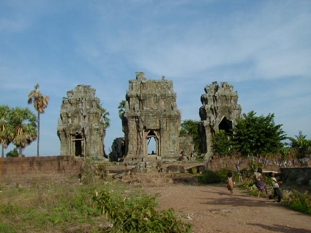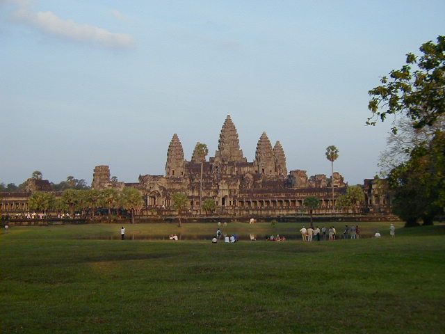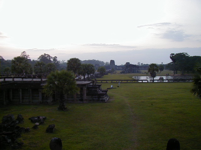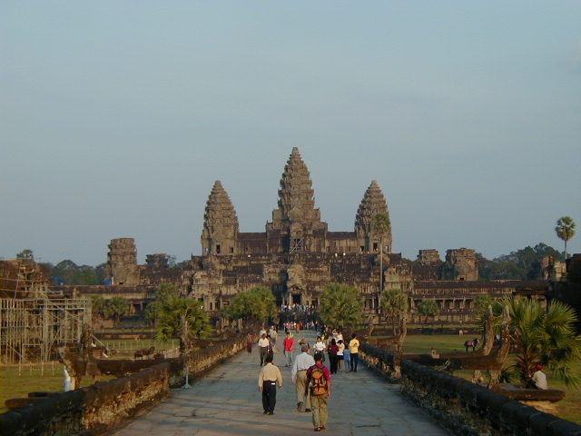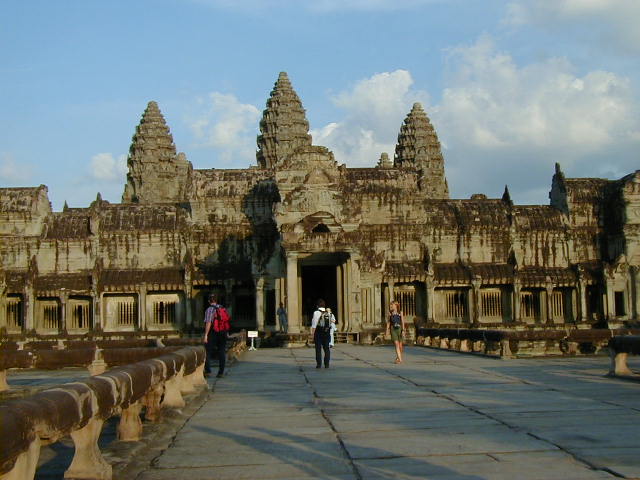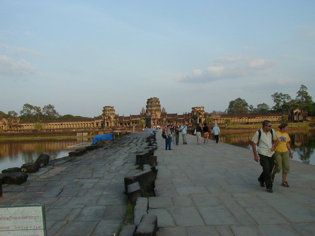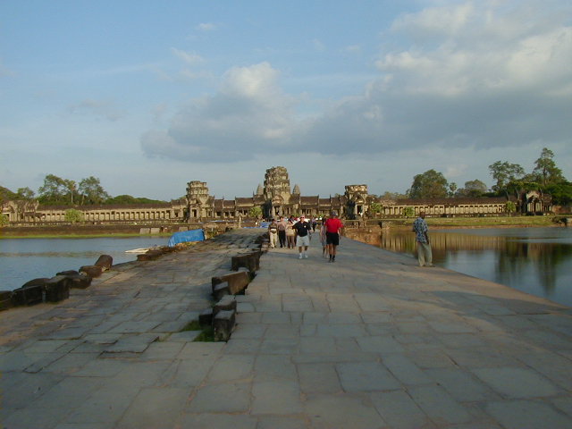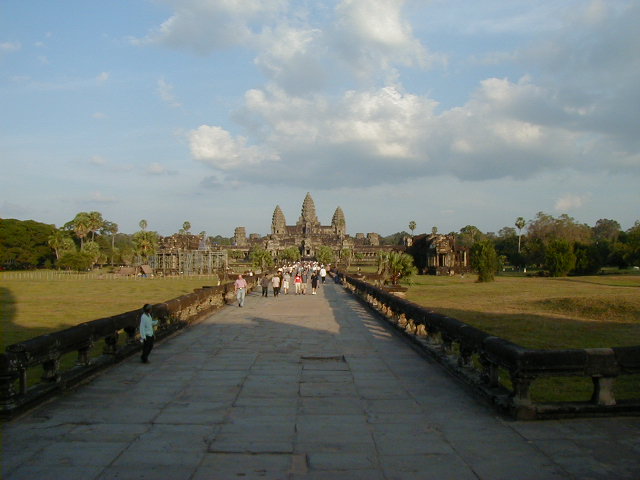 Angkor Wat, the largest, best preserved, and most amazing temple of the Angkors, and the most impressive ancient site I've visited. Ephesus, Aphrodisias, the Acropolis of Athens, Delphi, and the Roman forum don't come close. I even have to put Angkor Wat ahead of the Alhambra. The first picture is of the long bridge across the very wide moat surrounding the temple complex. On the far side of the moat are the halls that form a rectangle with a perimeter of three and a half miles enclosing an area of 500 acres (five and a half kilometers perimeter and 210 hectares enclosed for the metrically minded). Inside the perimeter halls, shown in the second picture, is the walk in the enclosed area leading to the Angkor Wat temple complex in the center. The third picture is of the main entrance to the temple. These pictures were taken in a futile attempt in showing the scale of Angkor Wat. The last picture if of a scale model of the inner temple complex. I took that picture in the Royal Palace grounds in Phnom Penh.