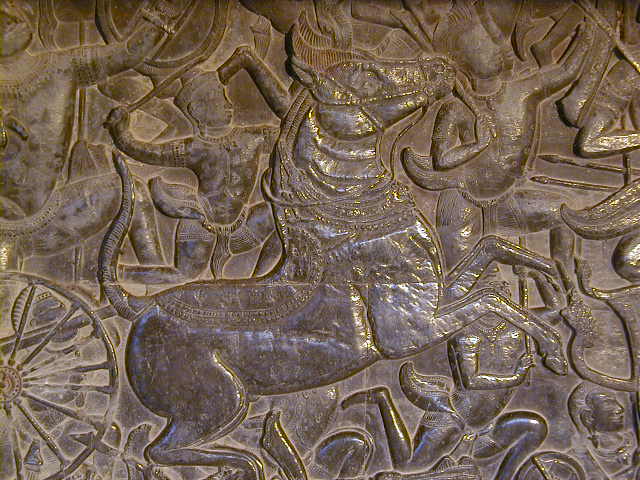 The central temple complex is surrounded by halls with beautifully detailed bas reliefs of the Indian epic Mahabarata. I believe the Cambodian's now prefer the Ramayana. I'm more into Hemingway and Twain myself. Originally the reliefs were painted with brilliant colors. It must have been stunning when it was new.