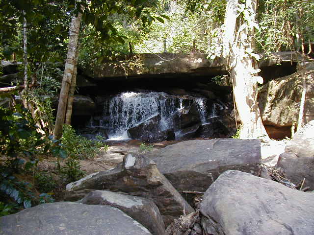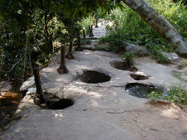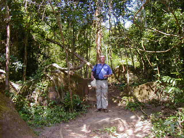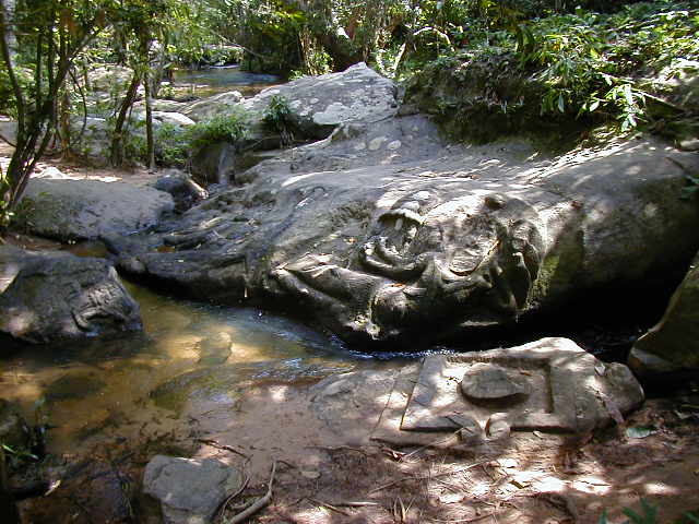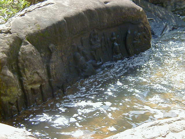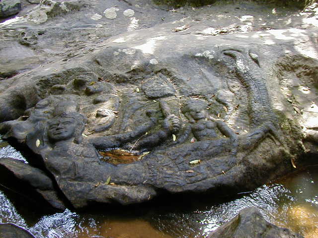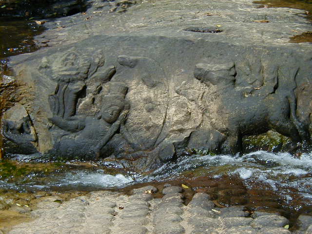 Kbal Spien, the River of a Thousand Lingas, was a sacred river to the Angkors. It has numerous religious theme rock carvings in the river bed and once had many lingas. All the lingas have been looted. I'm not sure what the significance of a linga is, but the ones I saw looked suspiciously phallic. Reaching the carvings required an uphill hike on a jungle trail that has only recently been cleared of land mines. These are steep hills covered with thick jungle. I would not want fight in them or have to clear them of ordnance.