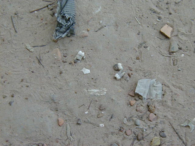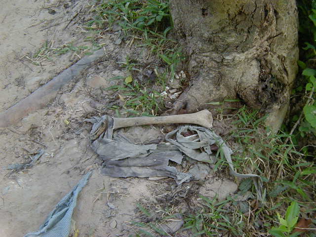 Most of the prisoners who weren't tortured to death at Prison S-21 were executed at Choeng Ek, one of the Khmer Rouge's Killing Fields. The site has been turned into a memorial to the victims. Between 1975 and 1978 17,000 men, women and children from the prison were executed there. Many were bludgeoned to death to avoid wasting bullets. Thousands have been exhumed, but the remains of many are still in the ground and scattered about on the surface. Pictured are a monument made of skulls, an excavated burial pit, some bones collected in urns besides burial pits, and bones and teeth in the trails underfoot.