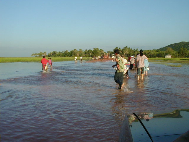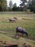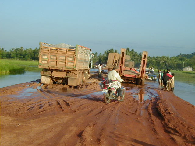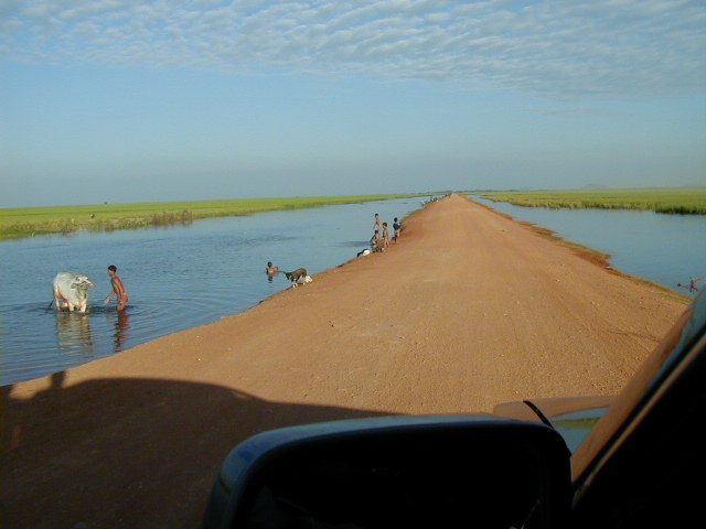 The last thing I'll mention about road travel in Cambodia is a description of the roads. In Phnom Penh I saw a few paved streets and other streets that may have been paved many years ago. Outside the city the roads are made of a clay/rock mixture that is wetted down and packed with a steam roller. Traffic quickly wears out the road and rain washes it away. The following three shots are of the road crossing the rice fields between Poi Pot on the Thai border and Siem Reap. It is one of the major highways in Cambodia. This is what the road is like on a better than average day. I assume that during the rainy season, which lasts from May to October, long stretches of the road disappear and have to be rebuilt when the rains end.