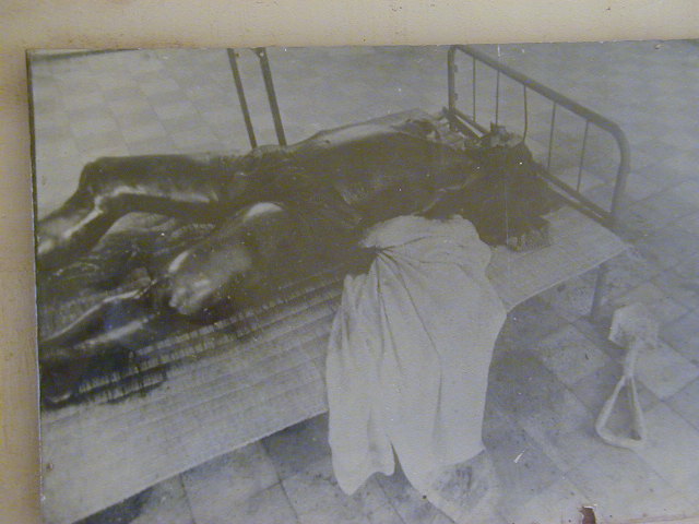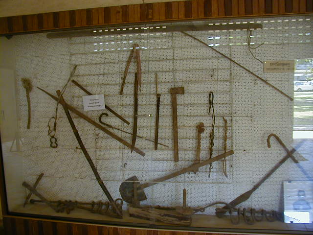 While in power the Khmer Rouge would take children between ten and fifteen and train them to be cruel prison guards contemptuous of the prisoners. They needed specially conditioned people to work in Prison S-21. The first picture is of the school/prison, followed by shots of grainy black and white photos taken of prisoners tortured to death. The pictures are of poor quality but you get the idea. After that are photos of some of the prisoners, many who were clearly children. Finally there are picture of the manacles used on the prisoners and a painting showing how they were used. Last are some of the some of the torture instruments used in the prison. There were paintings showing how these instruments were used, but they were over the line for my website.