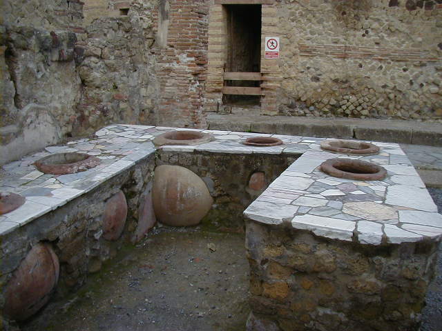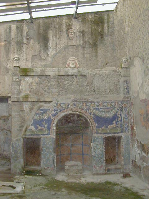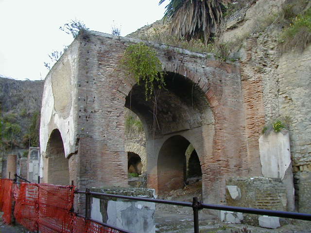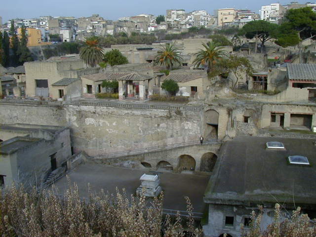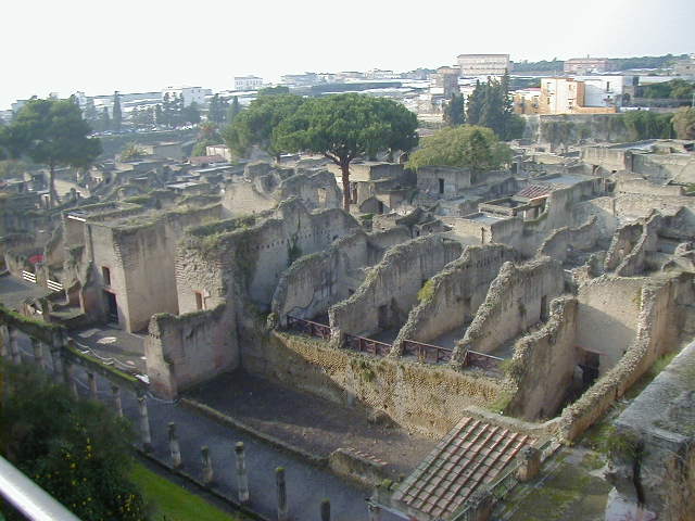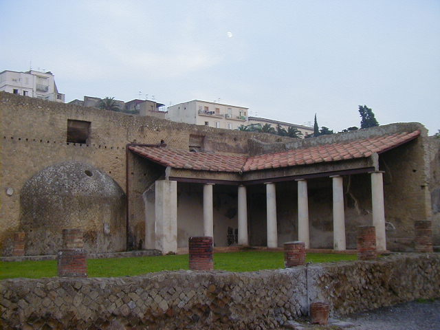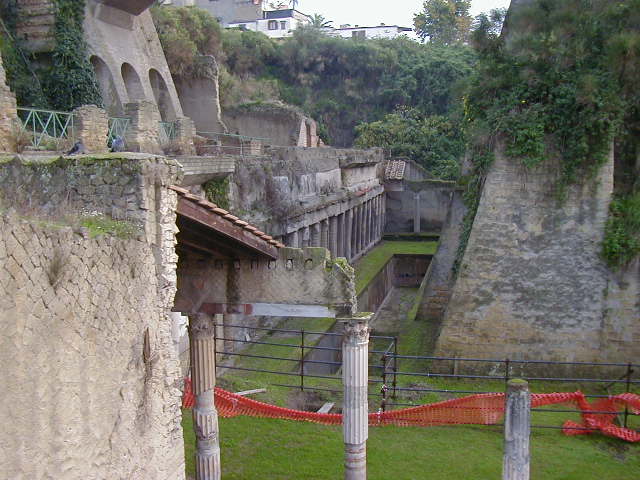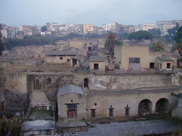 Herculaneum was a town between Pompeii and Naples buried under the same 79 A.D. eruption of Vesuvias. Most of the people of Herculaneum escaped. While Pompeii was a working town with shops and other businesses, Herculaneum was sort of a resort town for the rich. Pompeii had lots of businesses; with the exception of a gymnasium, baths and fast food places, most of Herculaneum consisted of fancy houses.