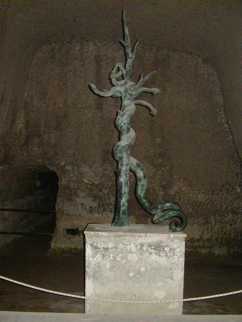 The next two pictures are of a city street, with the second picture showing the polished white marble placed in the street to act as reflectors at night. Bet you thought reflectors were a new idea. After that is the bronze five-headed hydra that was in the gymnasium fountain, and a tunnel through the earth filling and covering the gymnasium. Most of the gym is still buried. After that is a picture of the gym pool, which shows the modern houses on the ground covering the gym.