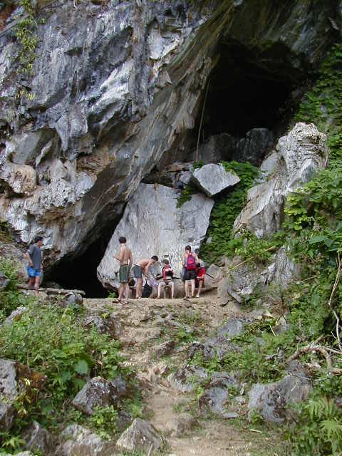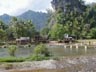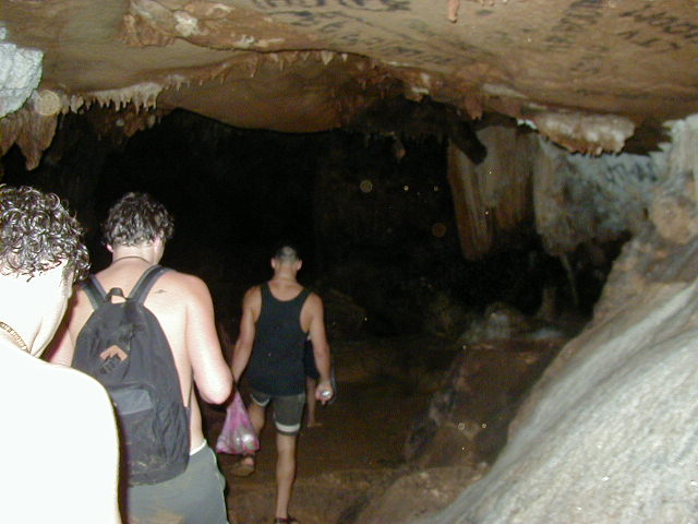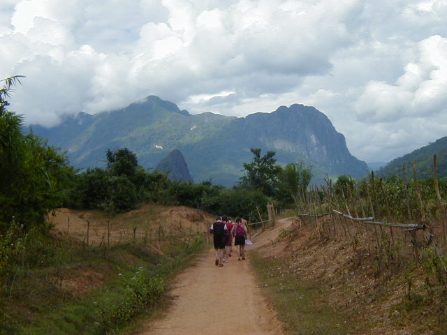 I left Vientiane by bus on 12 Dec and stopped in Vang Vieng. This is a fun village. I predict it will replace Khao Sanh Road in Bangkok as the worlds biggest backpacker hangout. Khao Sanh Road in Bangkok is overdone and getting expensive. Vang Vieng is a growing village that got electricity last year and has Guest Houses, bars, restaurants, and tourist shops going up as fast as they can be built. Many of the Guest Houses and bars are already showing bootleg videos of current movies; a very Thai thing to do. Laos people catch on fast. The village is a few hours north of Vientiane by bus, on the Nam Song river, near small Laos and Hmong farming villages and limestone hills riddled with caves. I stayed a few days, went on a guided tour and did some walking around on my own.