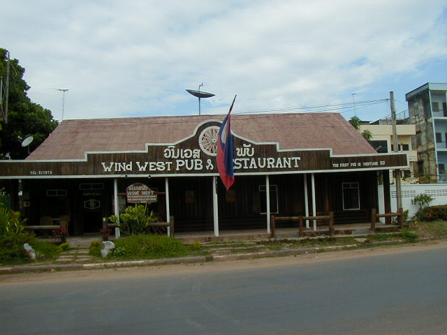 The next picture is the "Wind West Pub and Restaurant"; I think someone didn't get the spelling right. The last two pictures are of a typical street in the city, and then Taliat Sao, the morning market. In Laos this is equivalent to a major shopping mall.