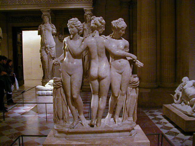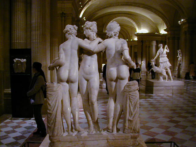 I think these belong in the category of ancient Greek sculpture. The first is the "Winged Victory of Samothrace" from 190 B.C. I want to call the second pair of pictures the "Three Graces", but I'm not sure it that is right.