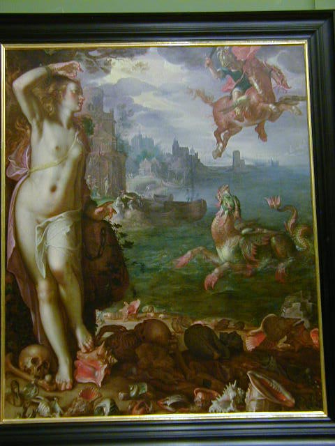 There were many rooms of paintings, thousands of paintings, enough to make me totally apathetic towards paintings. The picture below is not one of the really famous paintings in the Louvre, but it was the only one to catch my eye after I had become numb to everything else. This is "Perseus Rescuing Andromeda" by Joachin Wiewael. I think that's the name, my notes are so bad even I have trouble reading them.