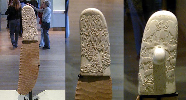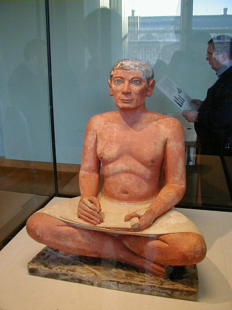 The entrance to one of the rooms in the Egyptian exhibits, the "Seated Scribe", from sometime between 2600 and 2350 B.C., followed by a late Neolithic (i.e., late stone age) flint knife with a handle carved from the ivory of a hippopotamus tooth. The knife is dated to between 3300 and 3200 B.C. I was surprised to see how advanced the art and craftsmanship was for such an early date. The handle was carved using stone tools and the detail is remarkable. The carvings looking very similar to the hieroglyphics that came later in Egypt.
