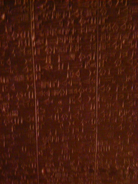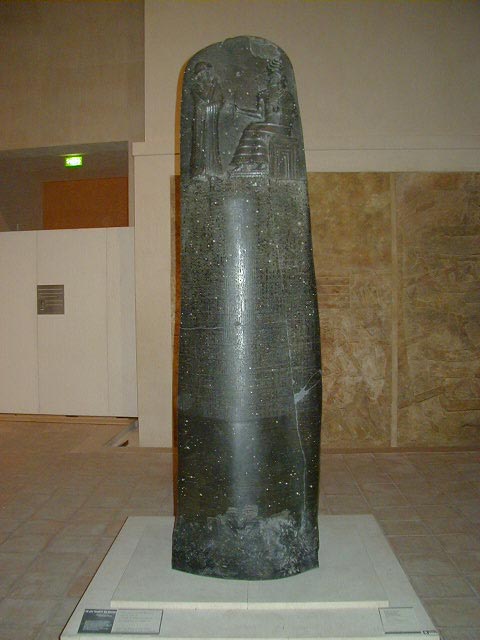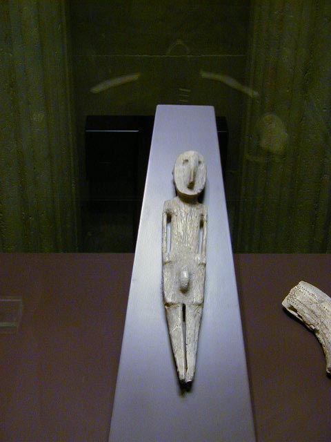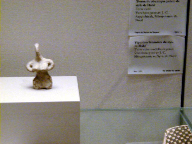 Hamurabi's Code, 1792 - 1790 B.C., the earliest known written law; a hippo tooth ivory carving of a stylized man dated between 5000 and 3500 B.C.; and a terra cotta female figure from Mesopotamia, dated between 6000 and 5000 B.C. Art has been found dating back 20,000 years, with most subjects being hunted animals, hunting deities, and female symbols of fertility. I heard on NPR that a cave with prehistoric art of the same theme of much earlier origins has been found in France. People, probably men, have been fascinated with hunting and women long before there was civilization.