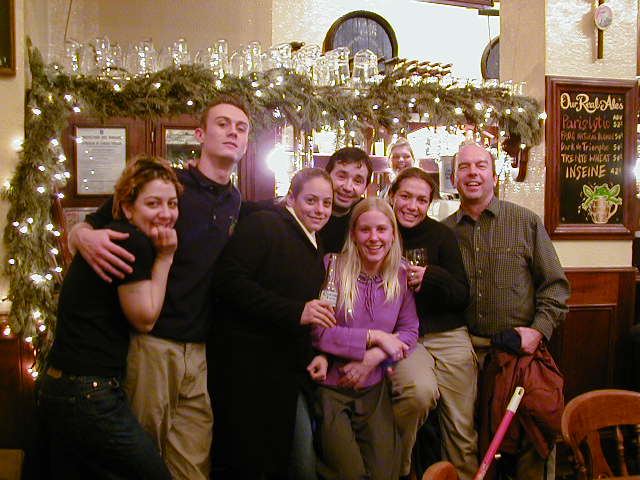 I preferred the bar scene on Rue St Denis, an area a little north of Notre Dame. My favorite place was an English bar called The Frog and Rosbif. This is where I met the U.S. college student, originally from St Petersburg, who told me about the Soviet Union's school system. Check the Russia page if you don't know what that refers to. I wanted to talk with her more, but a group of drunks on my other side, mostly in their thirties, found out I was older than any of them and insisted on a long and trivial discussion about it. Sometimes old people can be really tedious, even the ones who are younger than me. The picture isn't of the old people, with one exception of course, this is the college students, the bartenders and me.