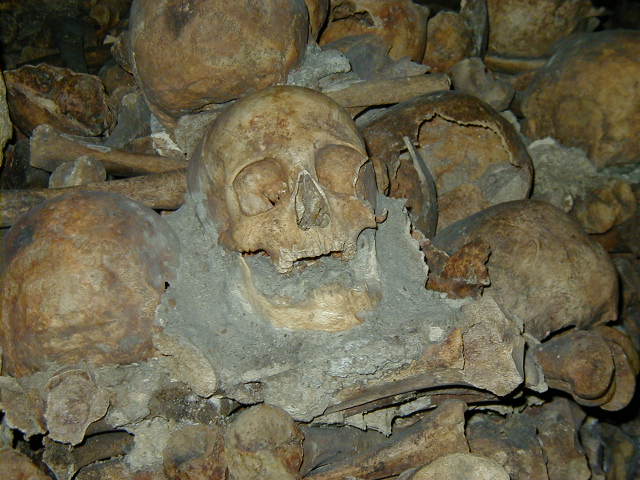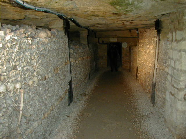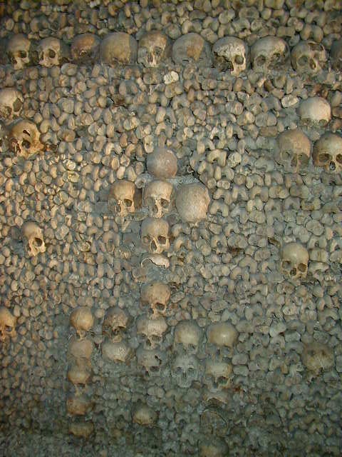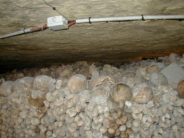 And now for something completely different--six million dead Parisians. Paris is a very old city that ran out of cemetery space more than two centuries ago. So in 1785 the city decided to exhume the corpses from these cemeteries and store them in three abandoned quarries. This is one of the quarries. What a great place for a Halloween party.