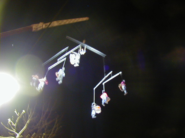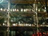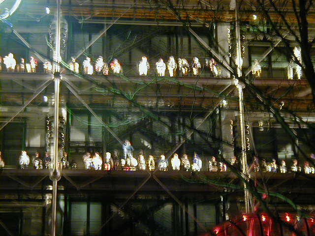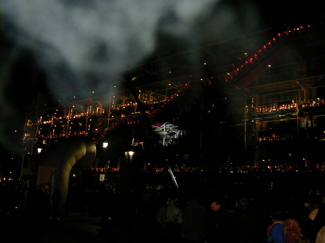 One night, after my investigation of the bar seen on St Denis, I followed the sound of music to a big show at the nearby Pompidou Center. It is a nightly event with lots of lights flashing and trumpets and drums and singers doing the type singing that uses melodic "oooh"ing and "aaaaah"ing instead of words and musicians playing from perches swinging underneath huge cranes. It didn't make any sense but was fun to watch.