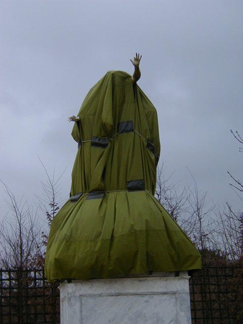There were a number of large objects in the garden covered up. This one is either a statue or an inept workman.