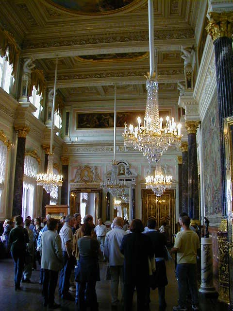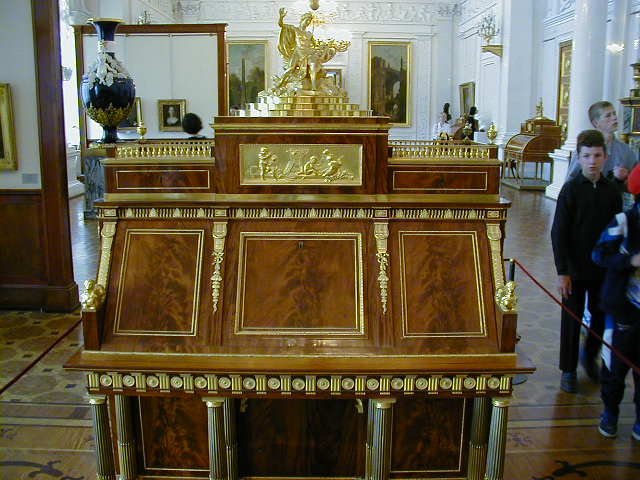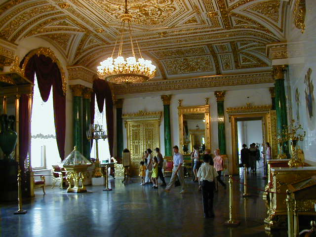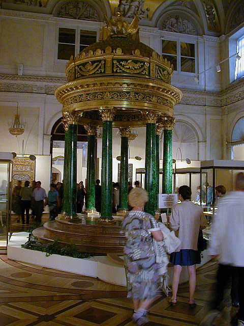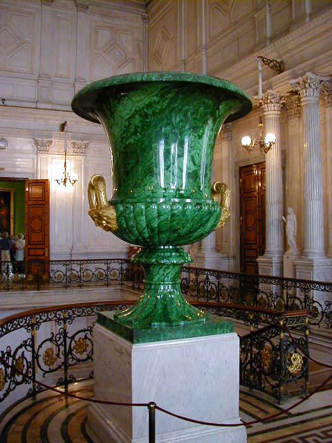 For those of you not up on minerals, lapis lazuli and malachite are semi-precious stones normally used in jewelry. The columns and giant vases here are not solid lapis and malachite, but are made by gluing thin pieces of stone on top of another material. They economized a little; nonetheless I've never seen such an extravagant use of these stones.