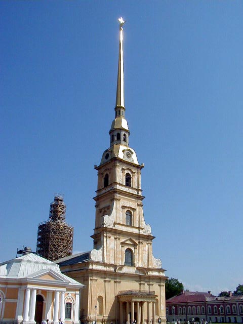 Saints Peter and Paul Cathedral, on Peter and Paul Fortress island, has a fun story associated with the spire. In the eighteenth century Czar Peter the Great wanted the church renovated so it would look its' best for visiting dignitaries. Somehow all the renovations were complete days before the visit except the cross on top. At the time they didn't have big mechanical cherry pickers, so the only way the engineers could put the cross in place was by building scaffolding around the exterior, which would take weeks. Czar Peter wasn't too happy about this and wanted another solution. That's when a peasant volunteered to put the cross in place. He didn't ask for payment; peasants didn't do that. He climbed up the inside of the cathedral to the base of the spire, then climbed out with the cross and a few tools strapped to his back, and a piece of rope. Using the rope and his bare feet he climbed up the spire lumberjack style, put the cross in place while precariously clinging on, and climbed back down. Having the cathedral ready was important to Peter, and he and his court stood outside and watched the entire operation, cheering when the job was finished. When the peasant came out of the church and kneeled before the Czar, Peter took of his cloak and gave it to the peasant, gave him a bag of coins (a fortune in those days), granted him his freedom (peasants were effectively slaves), gave him a chalice and ordered the imperial eagle be tattooed on his neck. Then Peter decreed that whenever this peasant, who could now be identified by the tattoo on his neck, went into a bar with the chalice, he would get the chalice filled for free as many times as he wanted with his drink of choice. If anyone challenged him he would point to the eagle on his neck and the bartender had better get in line.