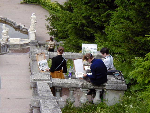 Here is a view of the palace grounds with the Gulf of Finland in the background. Also some water color artists I snuck a picture of. A picture of painters painting pictures. I like it.
